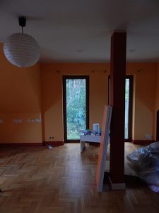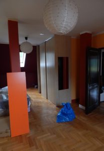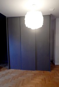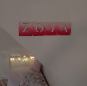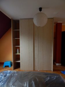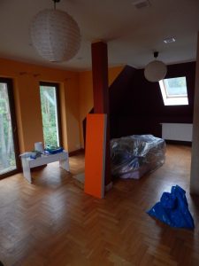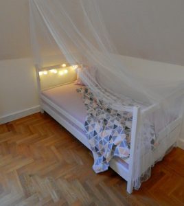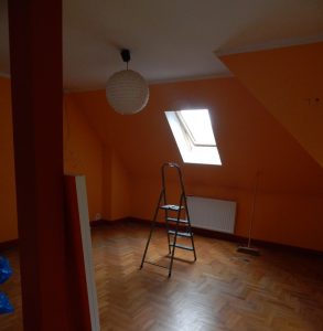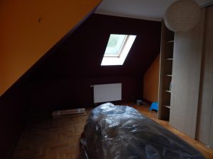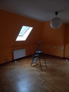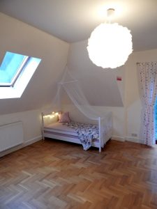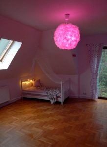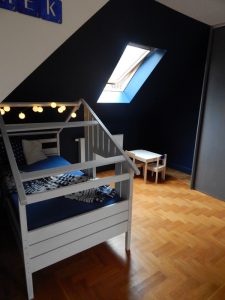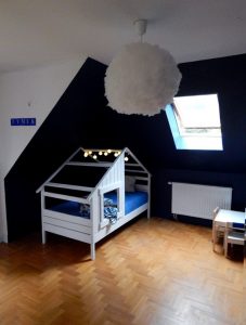 Metamorfoza: przestronny pokój dla rodzeństwa. Pokój ten jest dużym pomieszczeniem (ok. 24m2), ale przez to, że jest położony na piętrze domu, ma wyjątkowo dużo skosów i niską ściankę kolankową(1,40m). Dodatkowo są tam dwa okna dachowe i drzwi balkonowe, również dwie sztuki. Postanowiłam podzielić pokój przy pomocy kolorów i mebli na dwie części: pierwszą jasną dla dziewczynki, drugą ciemną dla chłopca. Zależało mi na tym, żeby każda z części była mocno zaznaczona, ale żeby jednocześnie pokój tworzył spójną całość. Zrobiłam to za pomocą motywu gwiazd, który pojawia się w każdej z części.