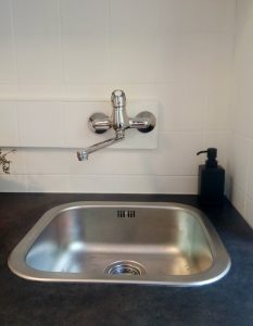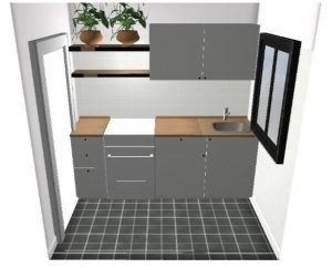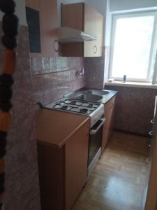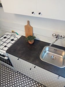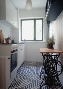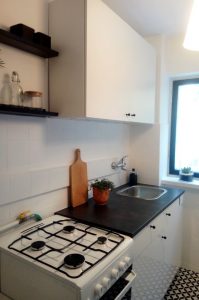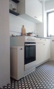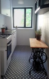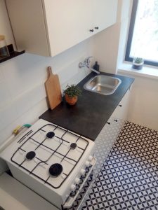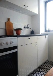 Metamorfoza kuchni w stylu retro. Kuchnia znajduje się w bloku na Mokotowie. Ma zaledwie ok. 3 m2 i była sporym wyzwaniem. Metamorfoza kuchni obejmowała wymianę mebli, malowanie płytek, wymianę podłogi i aranżację pomieszczenia.